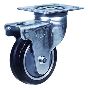 支架: 冲压脚轮座,使用强化热处理的双重钢珠槽旋转结构,一体化冲压支架,使用旋转部位防尘盖,可同时锁轮子和旋转部位的踏板双刹系统,螺栓式轮轴紧固